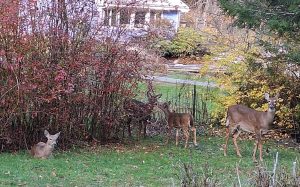 Startled to see us, the three large does — that is, female deer — veered away and cut through the yard, then around the house into the woods. As we climbed the stairs to our front deck, Timberley spotted what was wrong. “Look,” she said. “Over there. It’s hurt.”